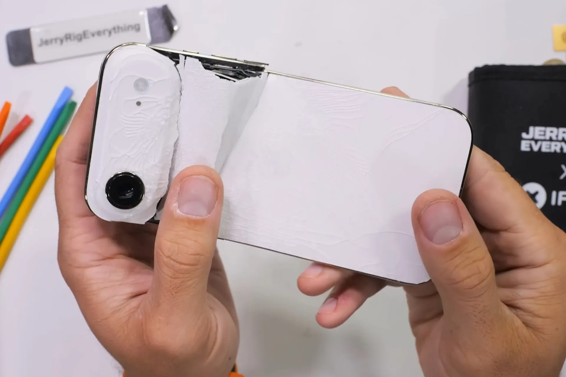 هاتف "آيفون إير" أثار دهشة الجميع عندما نجح في اجتياز اختبار الانحناء الشهير الذي أجراه زاك نيلسون، المعروف بقناته على اليوتيوب "جيري ريغ إيفري ثينج" (JerryRig Everything). نيلسون يعيد اختبار الهاتف الآن لاستكشاف مكوناته الداخلية وجودتها.