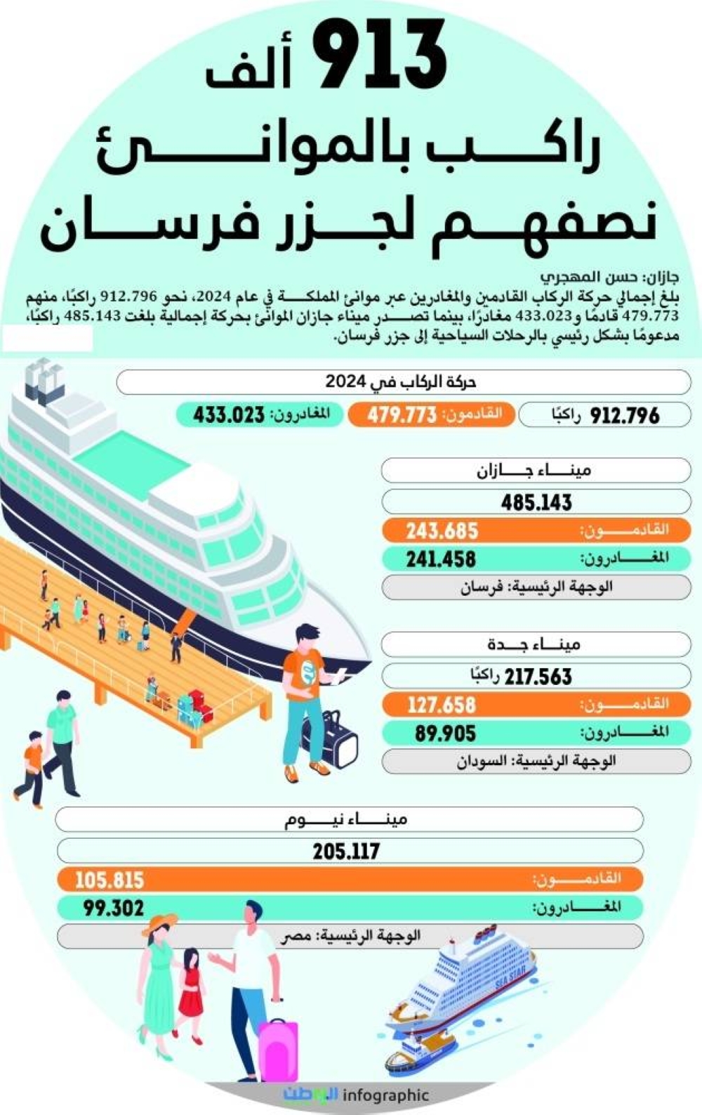 حركة الركاب في الموانئ السعودية: 913 ألف راكب نصفهم لجزر فرسان